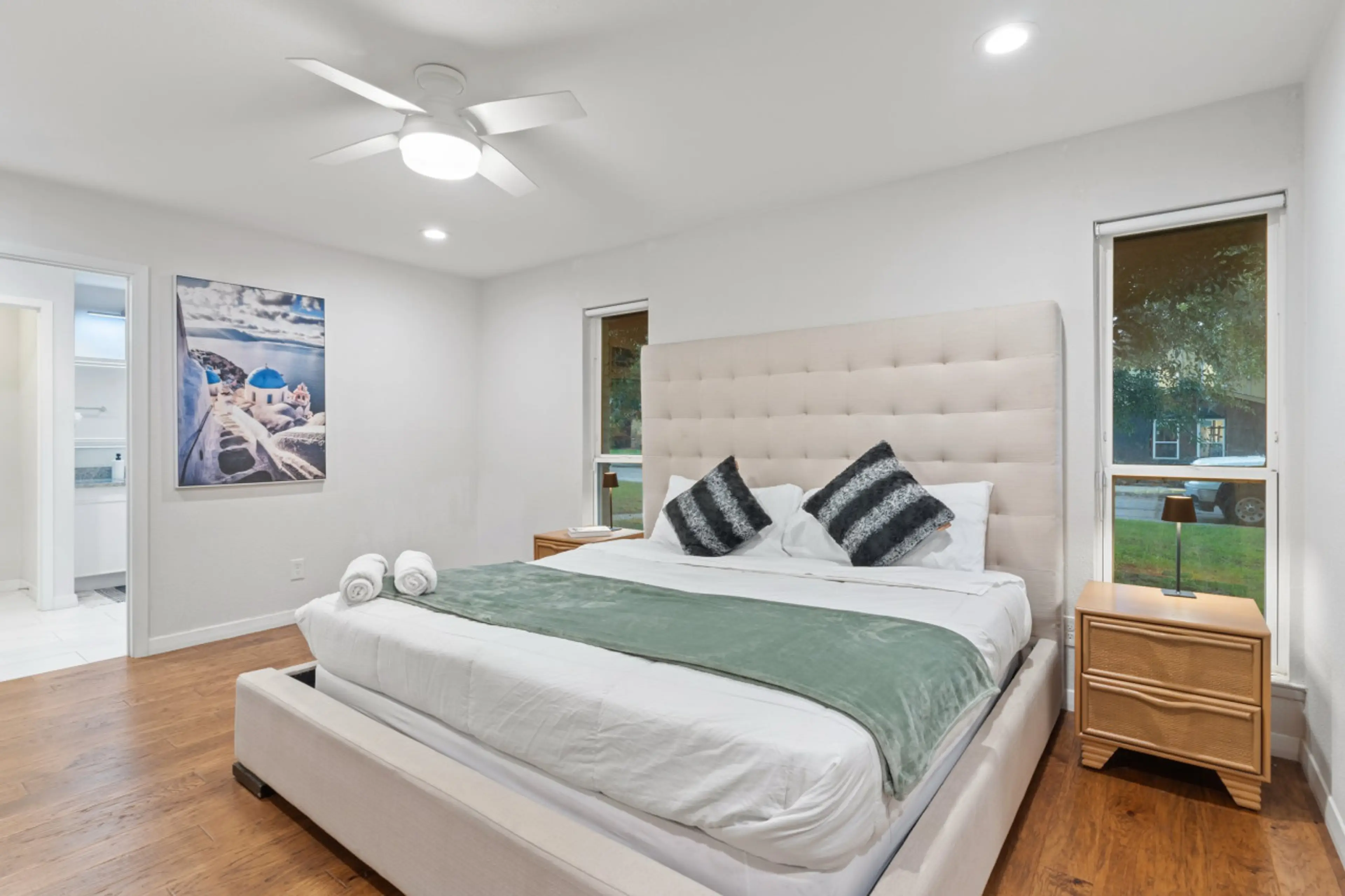Wonderfully clean and spacious with an excellent circular layout. Our 2 Frenchies’s and 2 Pugs stayed mostly in their crates when inside but when they went outside to the backyard; they loved running around safely in the privacy fenced yard. If we had stayed longer we would have grilled outside too. Thank you to the cleaning staff. It was immaculate!